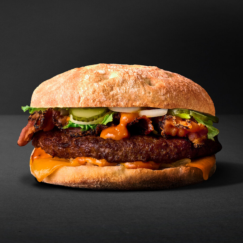 Der er kommet en ny sherif på Sunset Boulevard. En skarpskydende burger med 170 g. bøf af irsk herefordkvæg, krydret western-dressing, peberbacon, cheddarost, pickles, iceberg og løg– et pletskud i limited edition! Prøv den, før den rider videre mod solnedgangen.